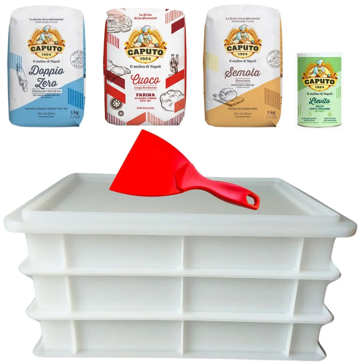 Startset Pizza deegkratten 3 x Wit met deksel, spatel, bloem, semola en gist